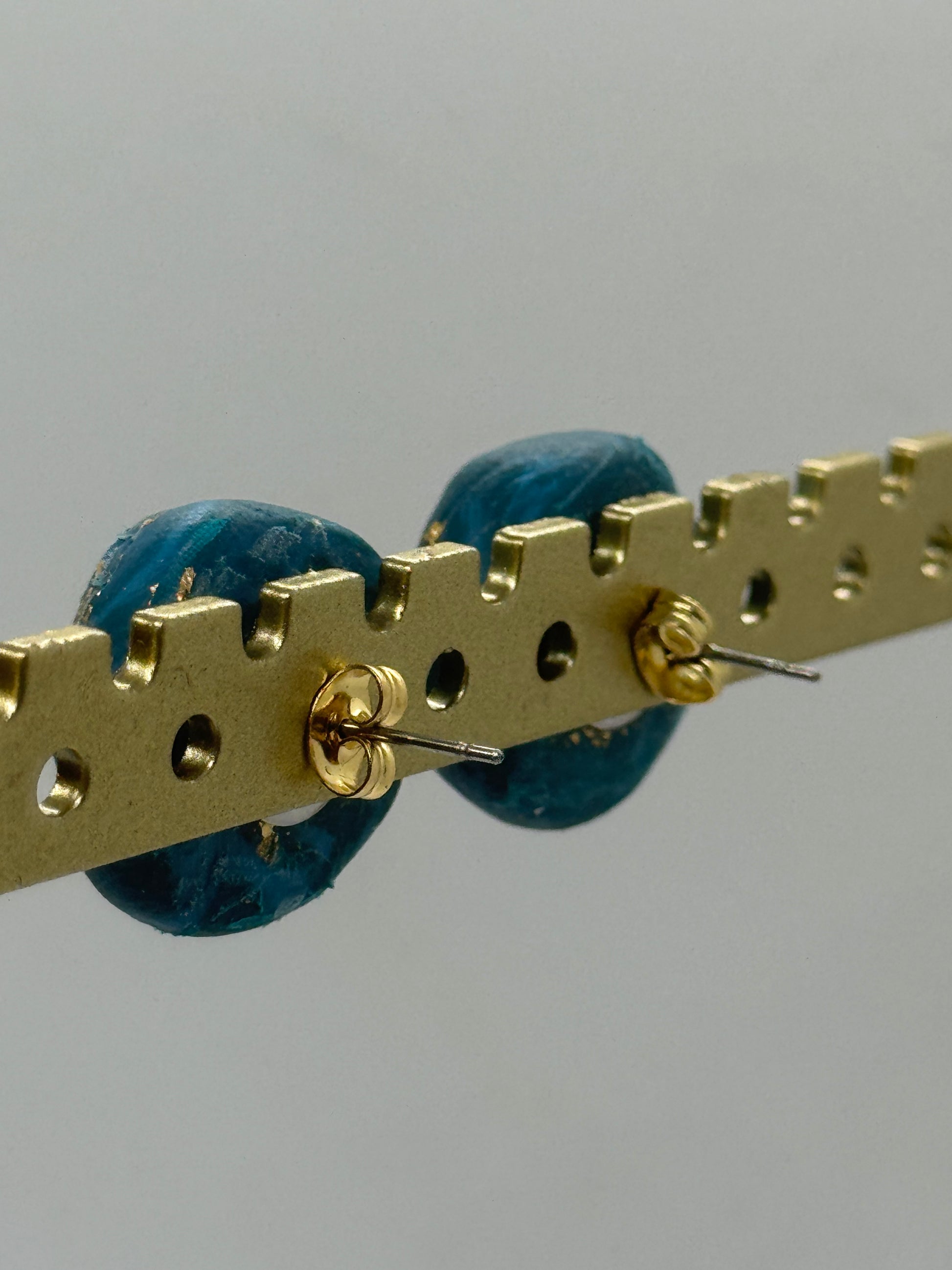 These handcrafted stud earrings feature a distinctive blend of materials, with amber centers embedded in blue-toned clay, highlighted by delicate gold-hued copper flakes. Made from hypoallergenic stainless steel, each pair is carefully sculpted to approximately 0.75 inches, ensuring both comfort and style. Expertly crafted in Oregon, they arrive in elegant gift-ready packaging, making them a refined choice for those seeking unique artisanal jewelry.
