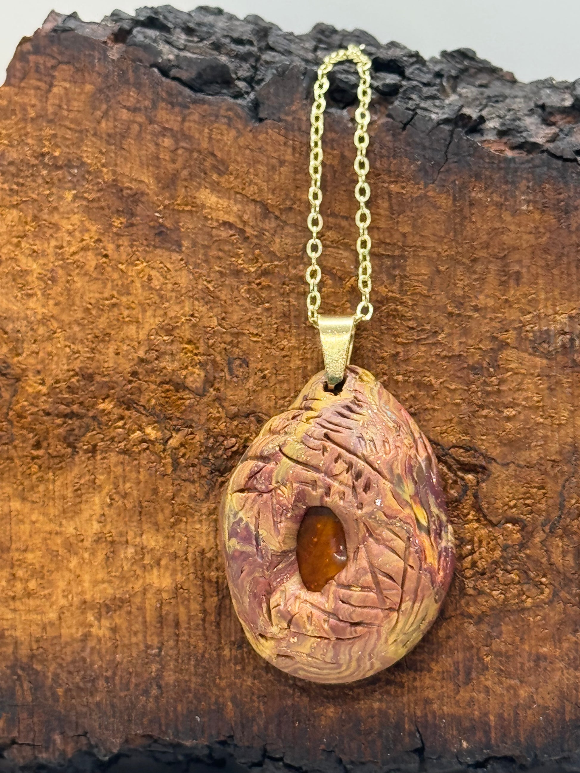 This necklace highlights a piece of amber set within meticulously sculpted and etched polymer clay, combining multiple shades of earthy browns with gold-toned copper flakes. The hypoallergenic chain and fittings are crafted from brass and plated with 14K gold. The necklace measures approximately 21 inches in length when fully unclasped.