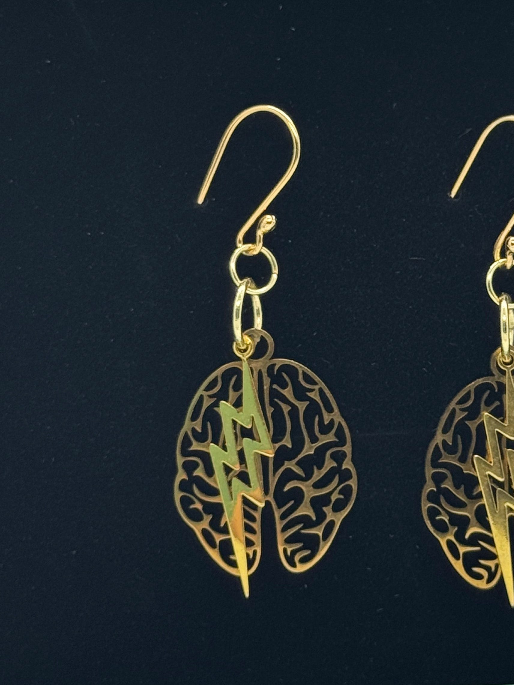 These "Brainstorm" hypoallergenic earrings feature intricately crafted brains paired with lightning bolt accents, finished with 18K gold and 14K gold for a refined finish. Perfect for creative minds, they symbolize sharp thinking and sudden inspiration. Handmade in Oregon and delivered in gift-ready packaging. Approximately 2 inches long.