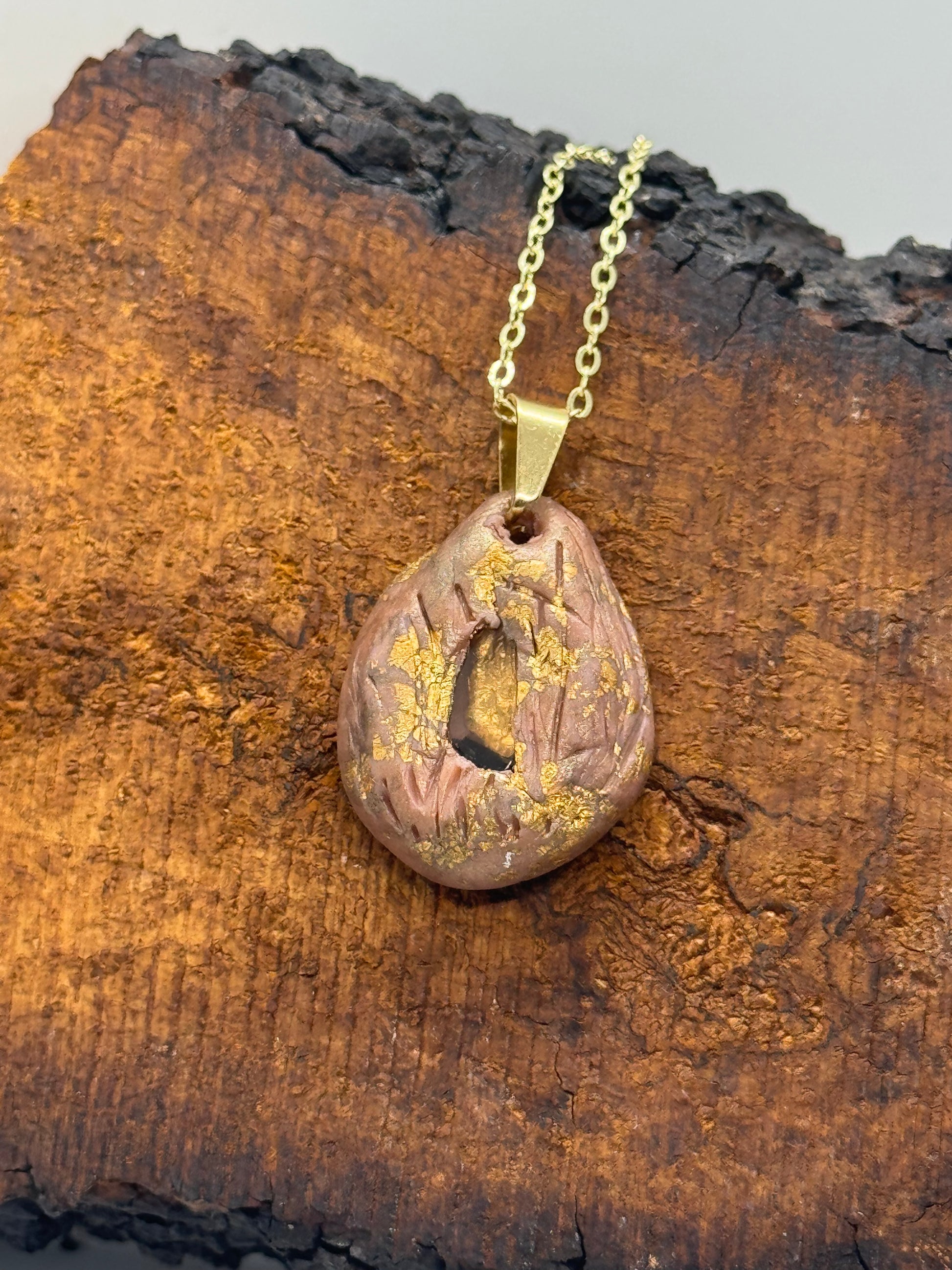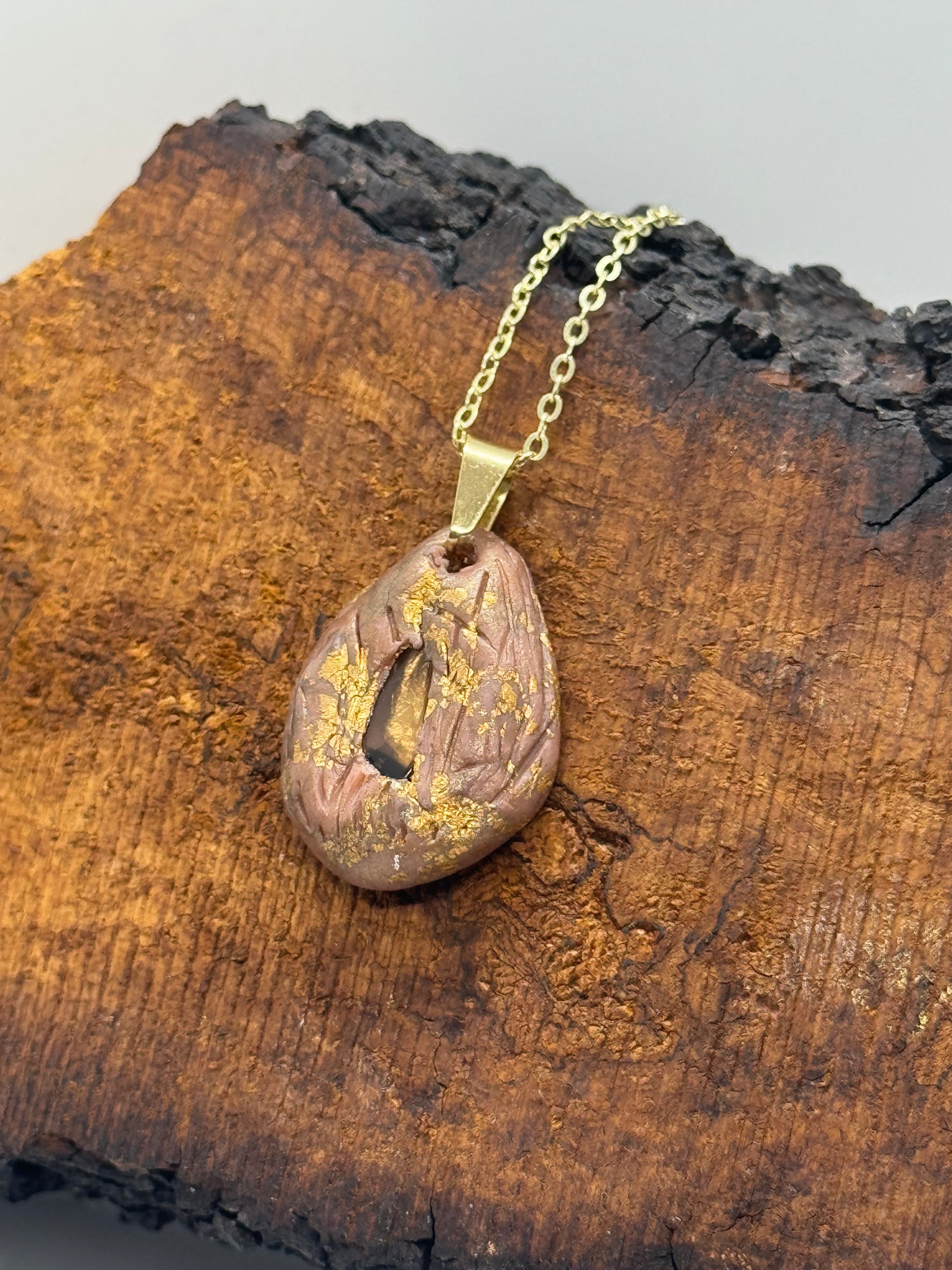Smoky topaz quartz crystal is at the center of this necklace. Embedded into carefully sculpted brown-hued polymer clay, copper flakes throughout add extra shine. Hanging from a chain finished in 14K gold and approximately 19 inches long, this piece is a cool addition to any wardrobe. Often associated with relieving stress and uplifting mood, this crystal is also easy on the eyes. Shipped in gift-ready packaging and made in Portland, Oregon.