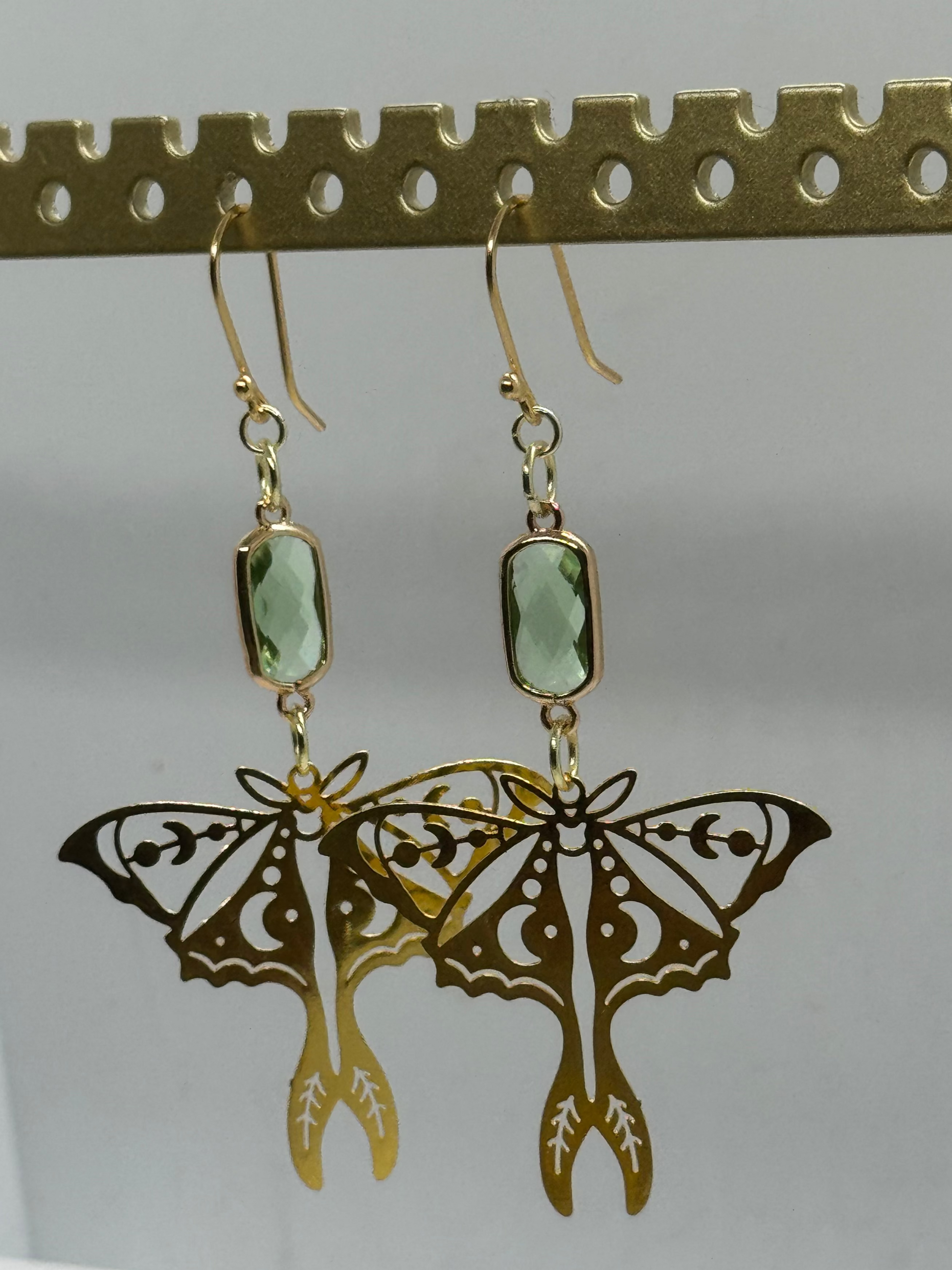 Mystical moth pendants finished in gold steal the show with these earrings, but the beautiful green glass is an important part of the look. Gold moth earrings can easily be dressed up or down.