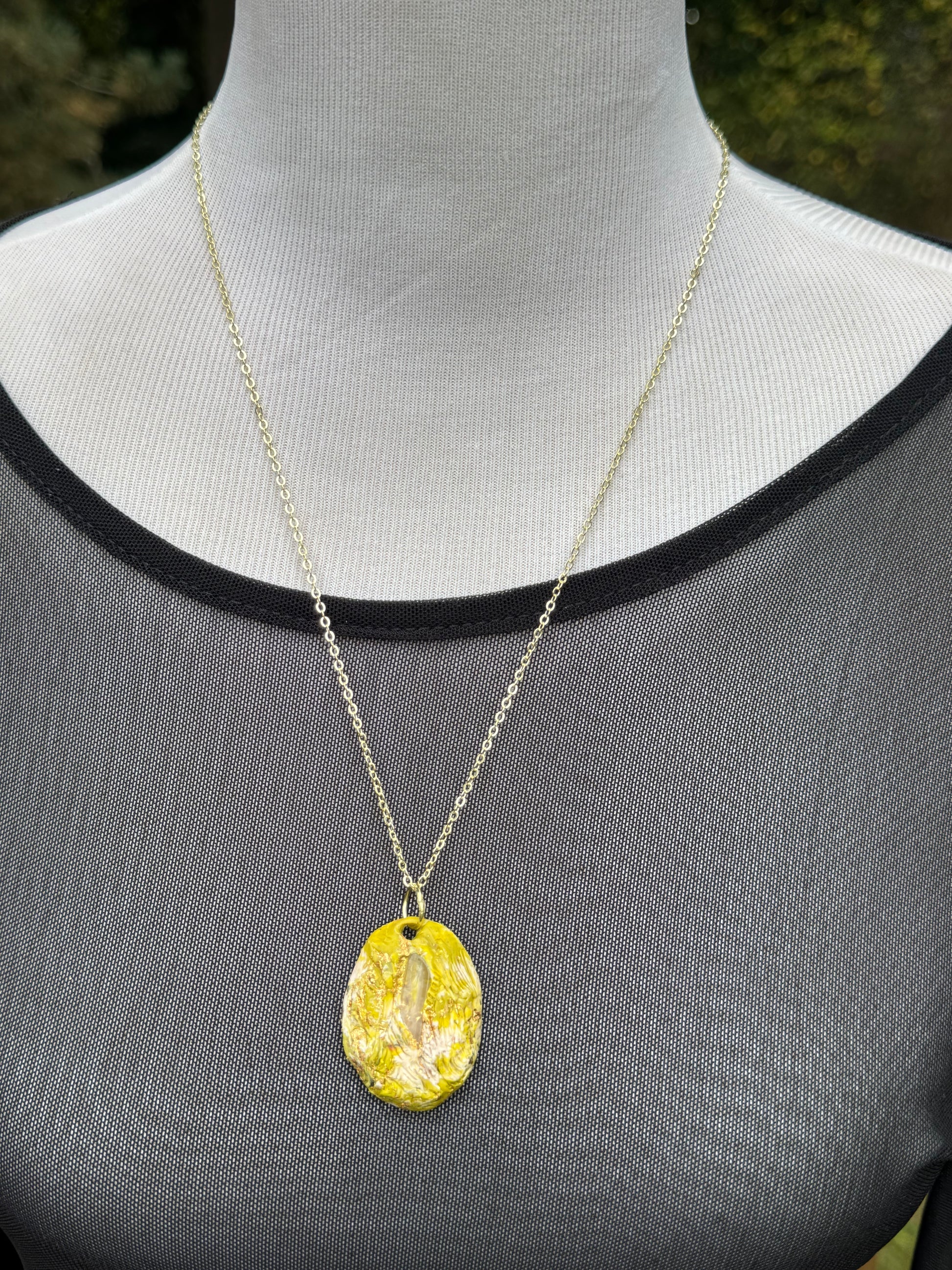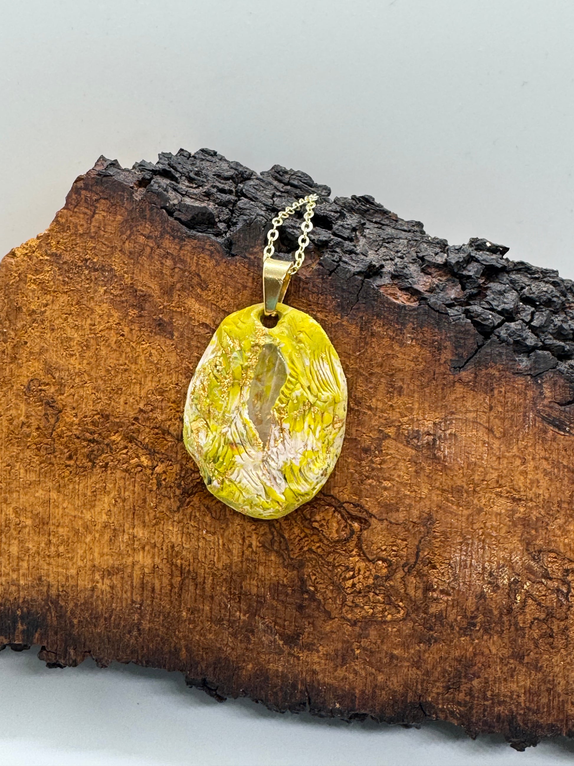This mossy-green, textured clay holds a piece of clear quartz, which is often associated with healing and clarity. The pendant sits on a gold chain.