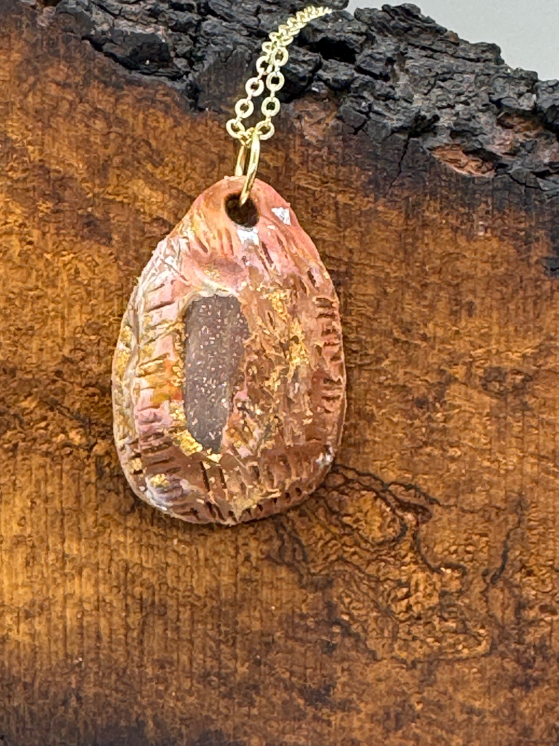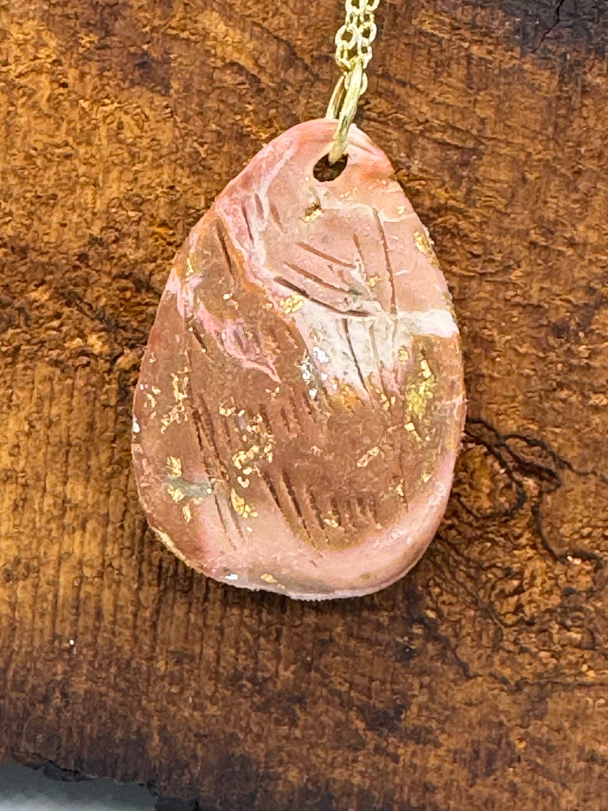 This handmade necklace features a luminous moonstone set within carefully carved earth-toned polymer clay, accented with gold-colored copper flakes. The 21-inch chain is finished with 14K gold, combining durability with elegance. The tactile contrast of smooth and carved surfaces offers a calming sensory experience.