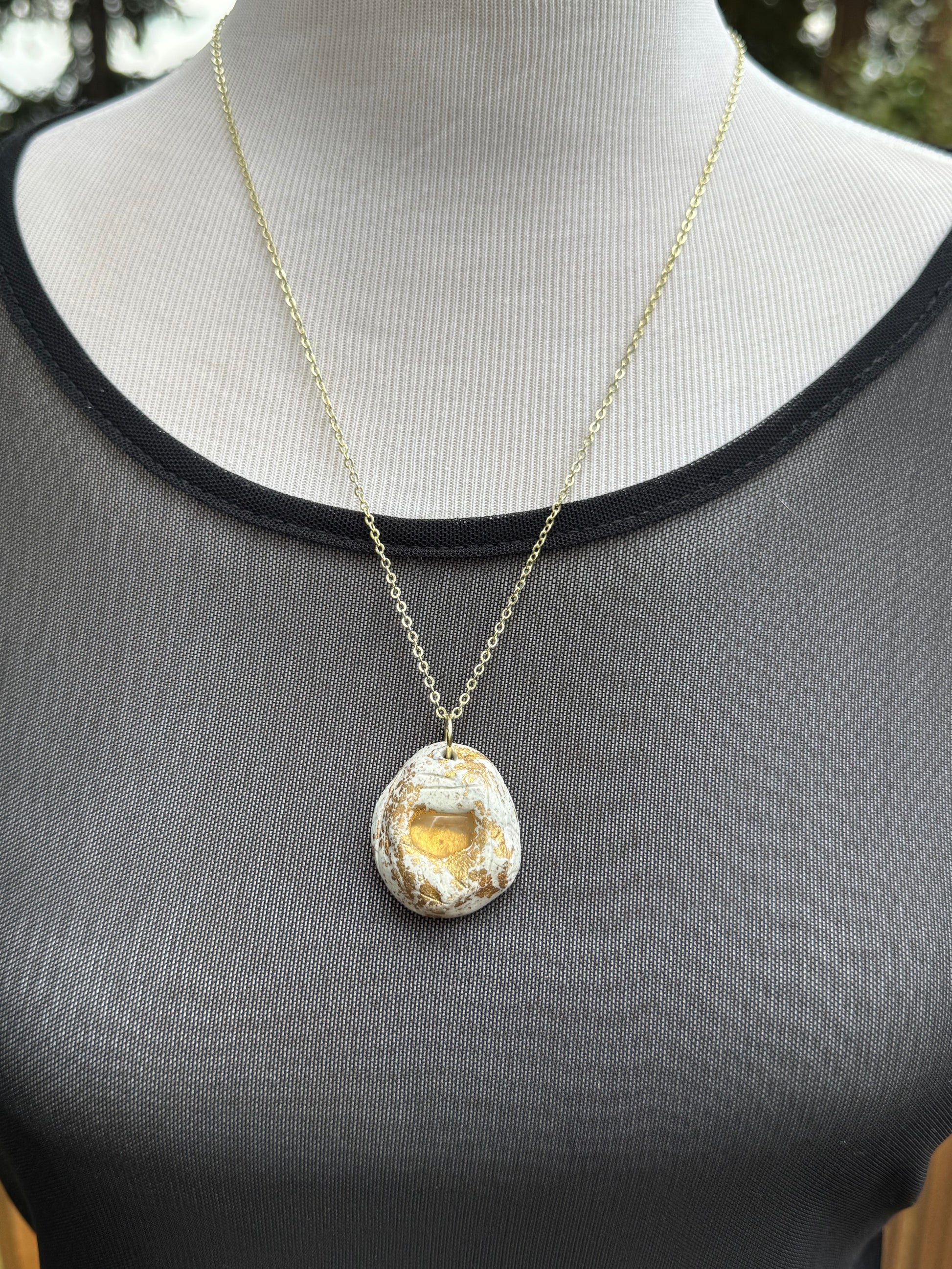 This necklace features real Oregon sunstone embedded into carefully sculpted and etched polymer clay. Various off-white shades mix with gold-toned copper flakes in this piece. The hypoallergenic chain and findings are 14K gold plated over brass. Necklace is approximately 23 inches long from one unclasped end to the other. The pendant-connecting jump ring is reinforced with jewelry-grade metal adhesive. Handmade in Portland, Oregon.