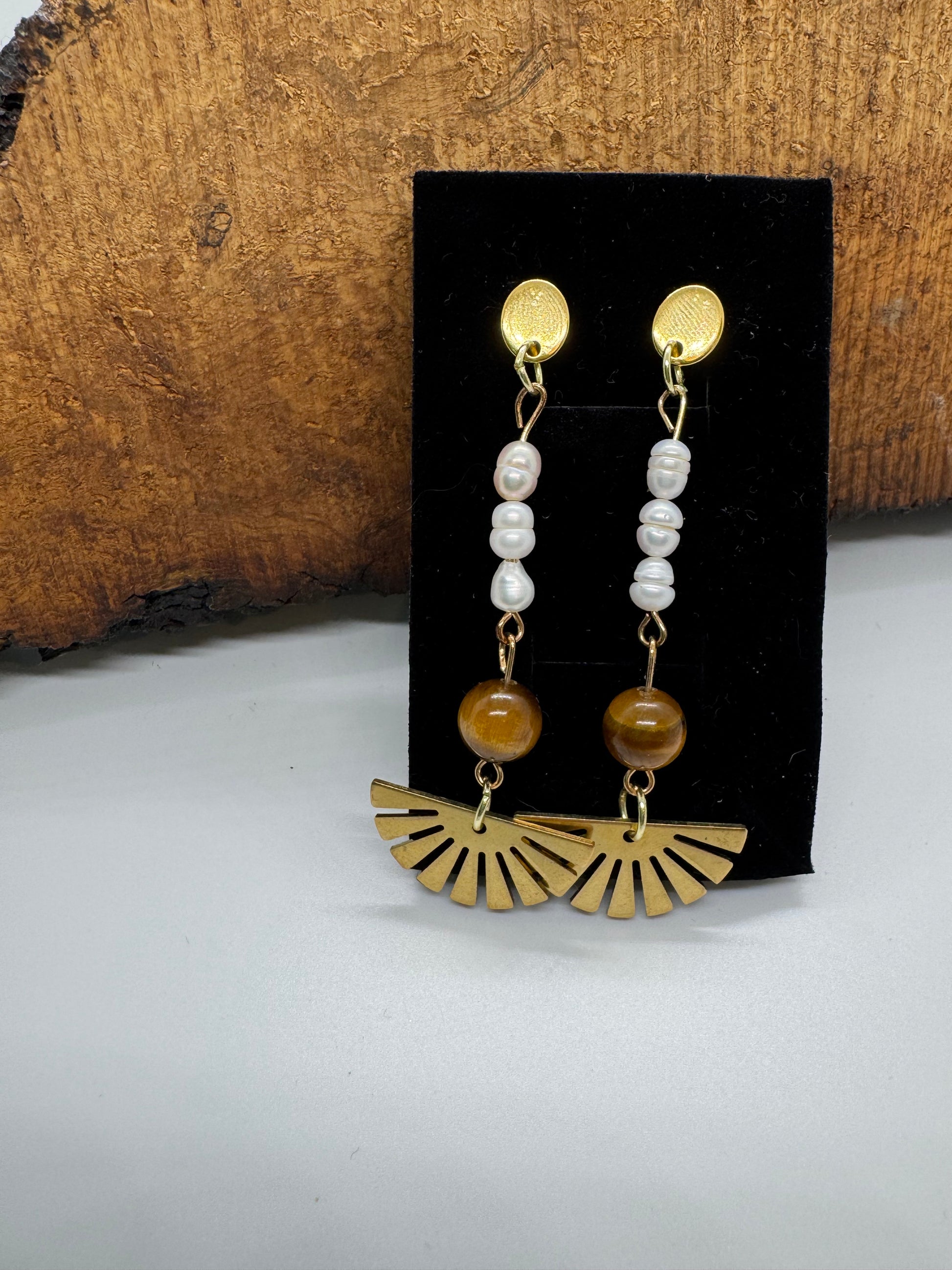 These exquisite "Psychic" earrings feature six genuine cultured pearls paired with tiger's eye stones, handcrafted in Oregon. The brass base is plated with real gold. Delivered in gift-ready packaging, these pearl earrings showcase nature's timeless beauty.