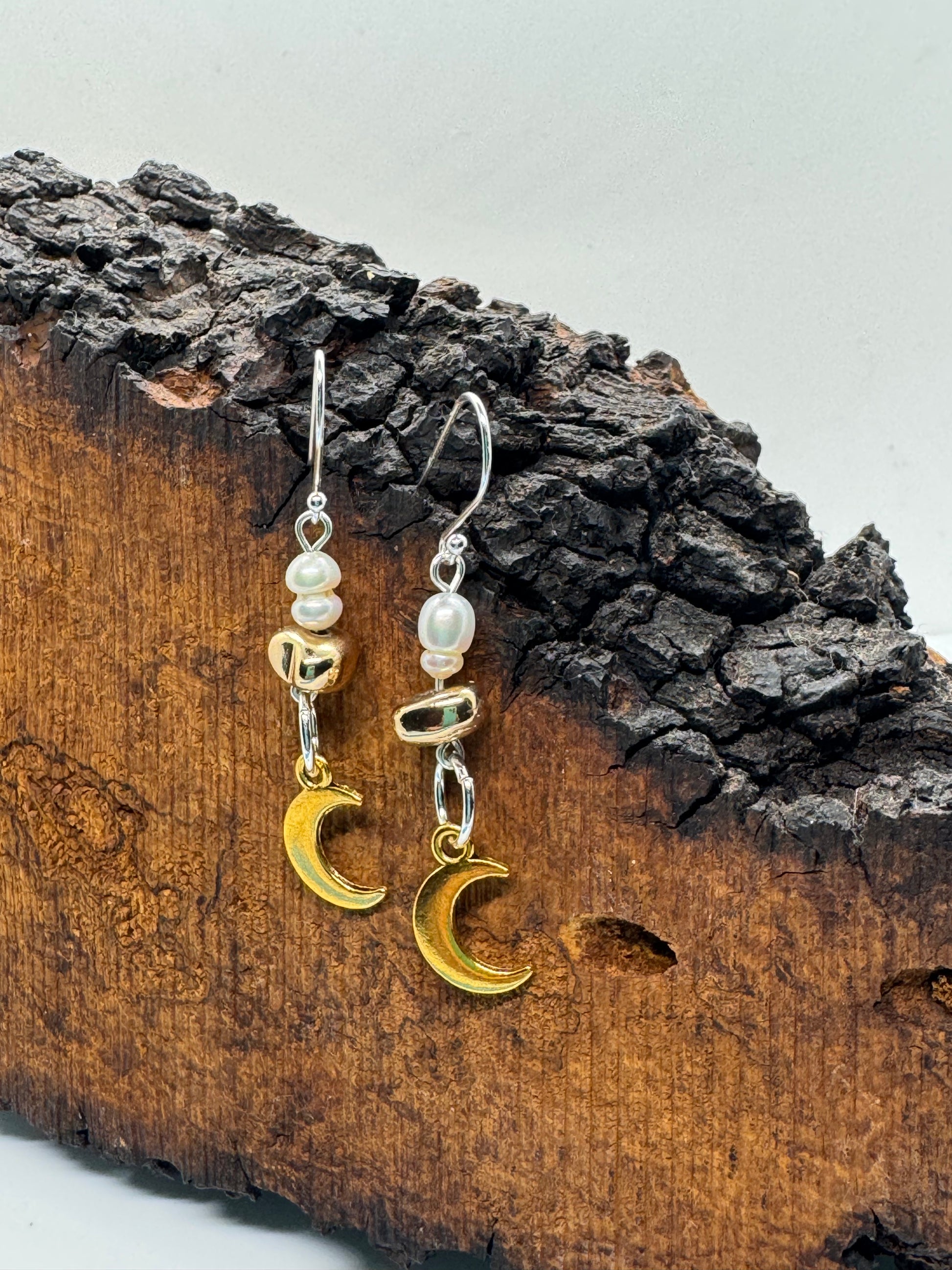 The "Moonlight" earrings showcase authentic cultured pearls paired with a chunky stone and crescent moon pendants, plated in gold. Hanging around 1.75 inches, these are handmade in Oregon, and each pair arrives ready for gifting.