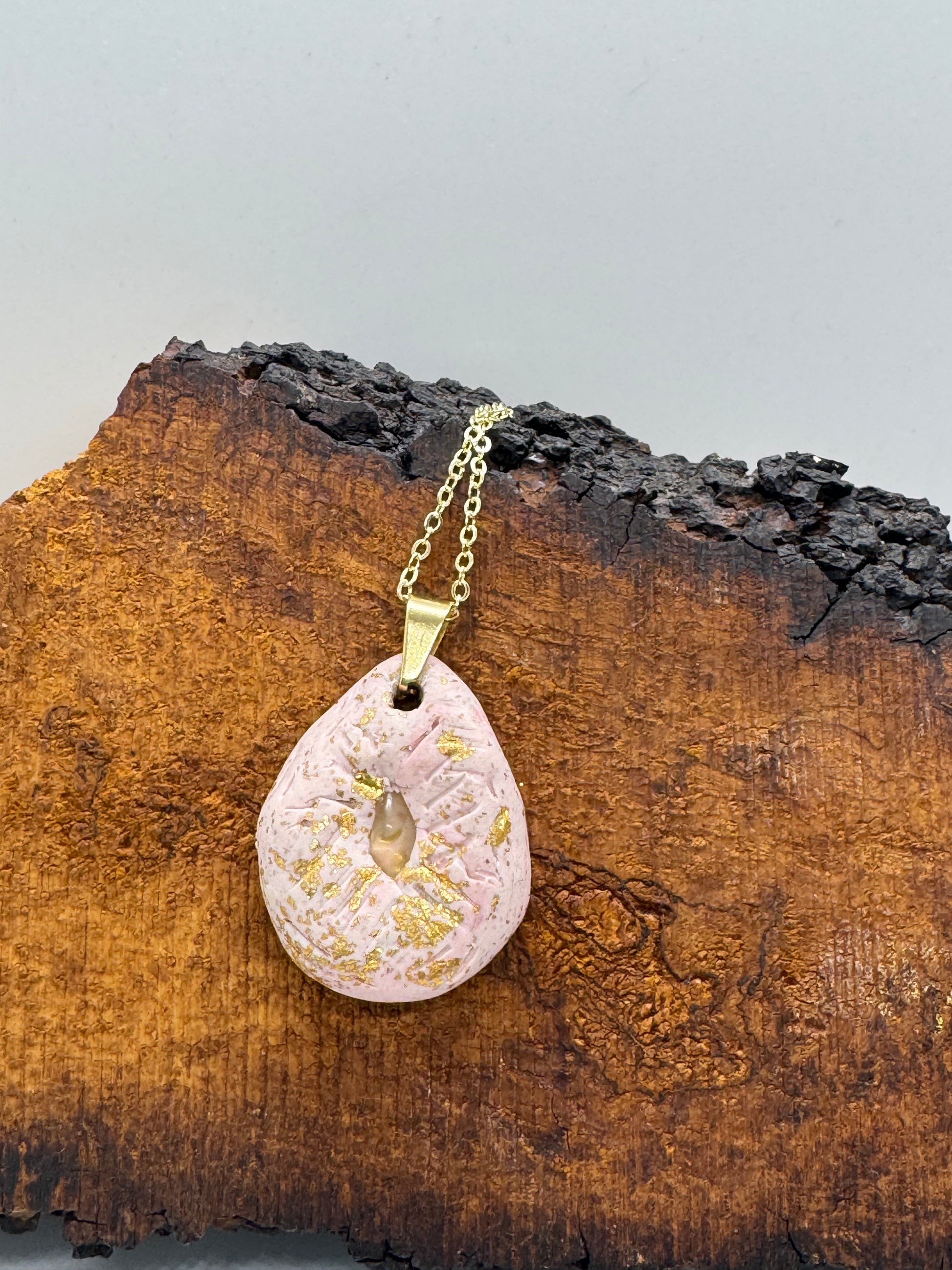 This pendant necklace showcases a glistening piece of sunstone in the center. The sunstone is embedded into carefully sculpted pink-hued polymer clay with copper flakes kneaded throughout. Etched with intention, the tactile nature of this jewelry piece adds to its allure — it's beautiful and nice to hold! Often associated with optimism and energy, the Oregon sunstone is a lovely gemstone.