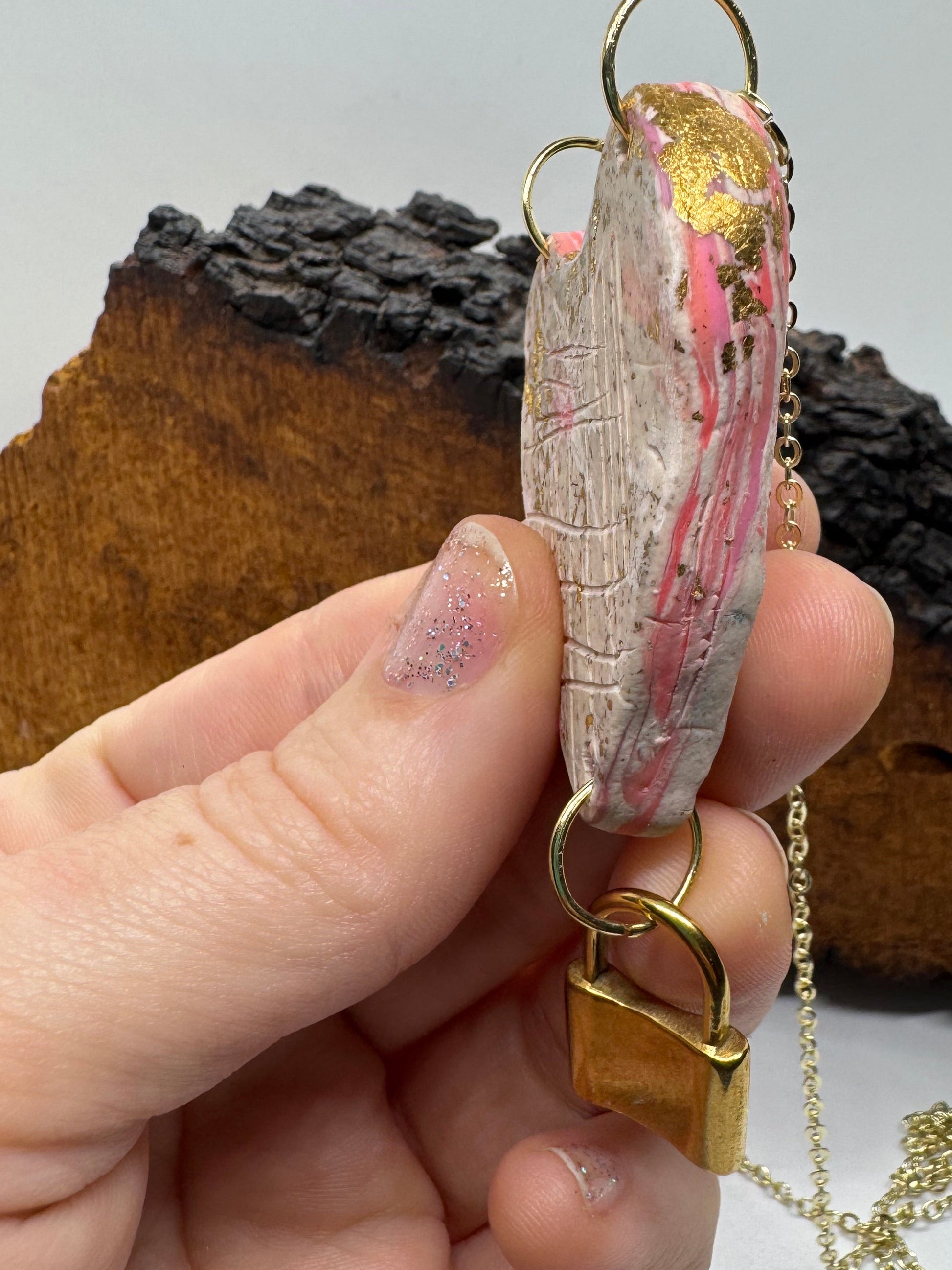 If you're in the market for a unique, heart-shaped necklace, check this one out. With the word "protect" etched into the pink and white heart, the pyrite and lock come together to create a piece that's all about love and careful protection of the heart — it's a balance!