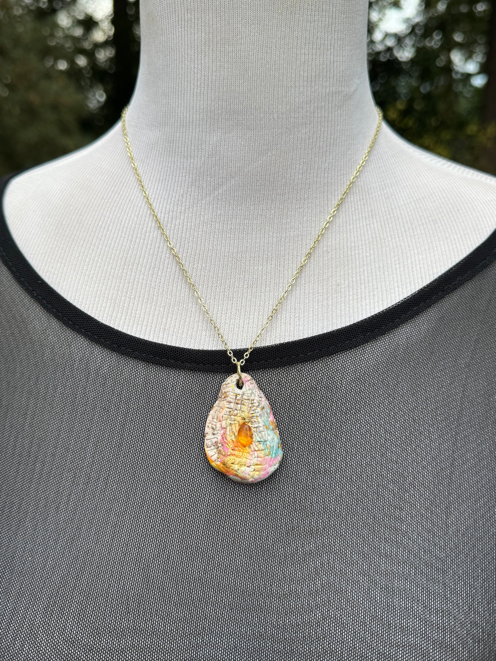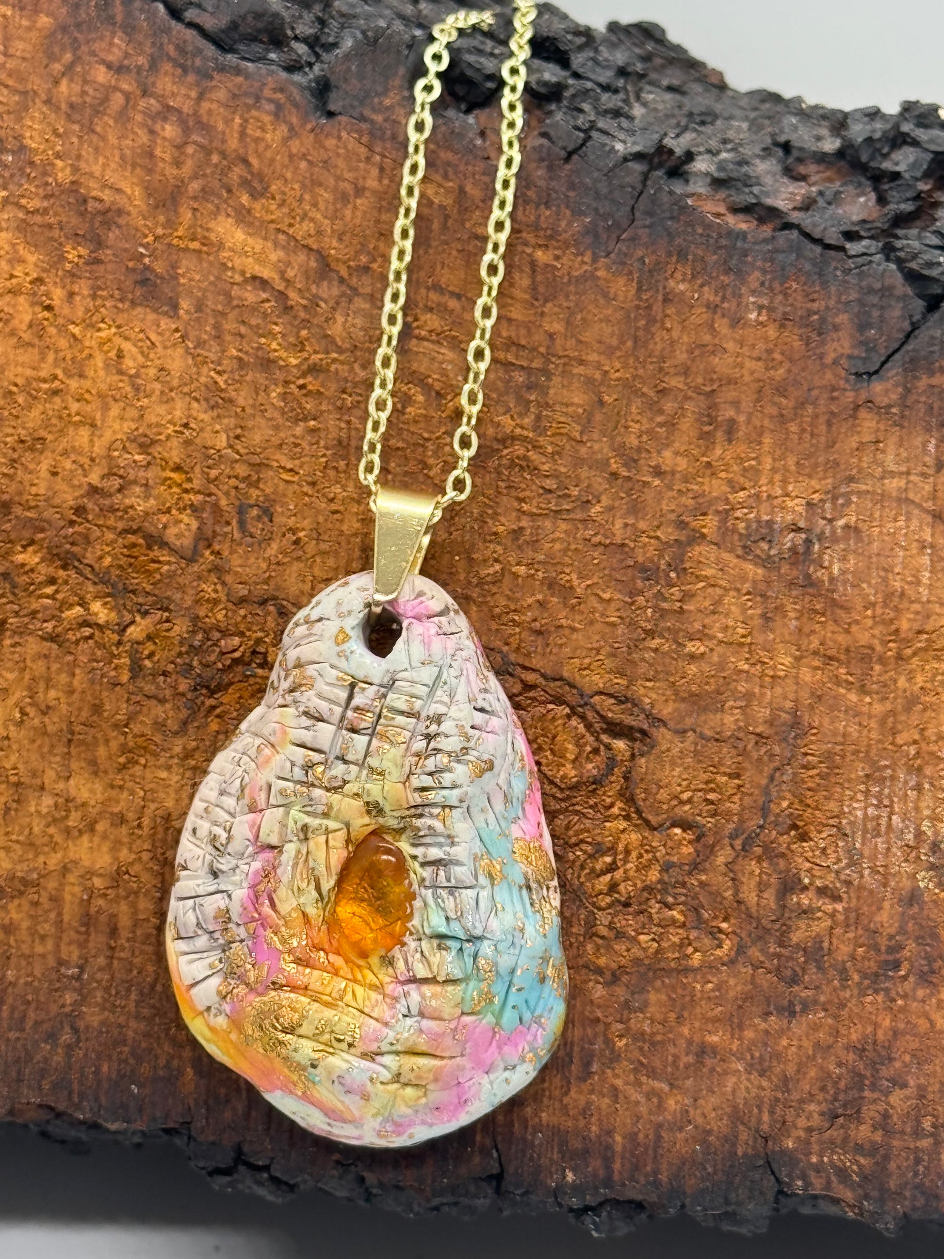 Often associated with light, warmth, protection, and healing, this amber and clay necklace is perfect for anyone who is drawn to amber and rainbow colors.