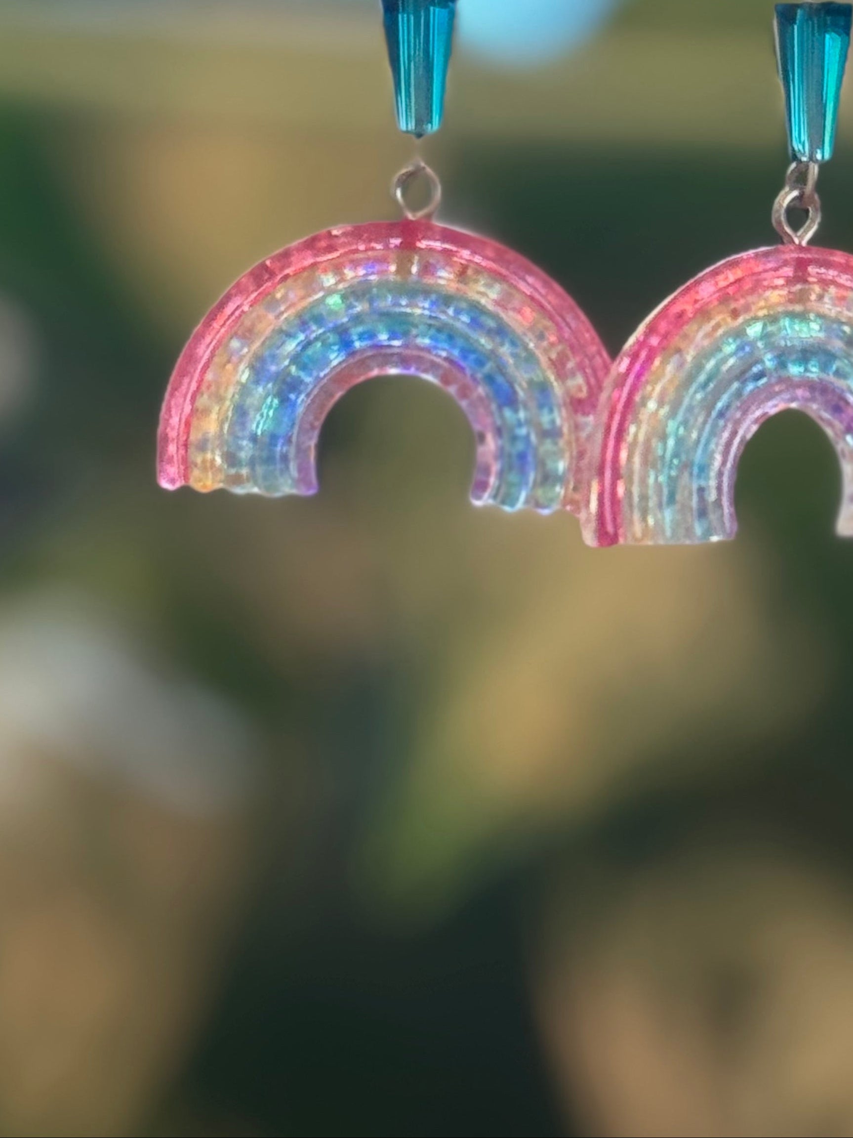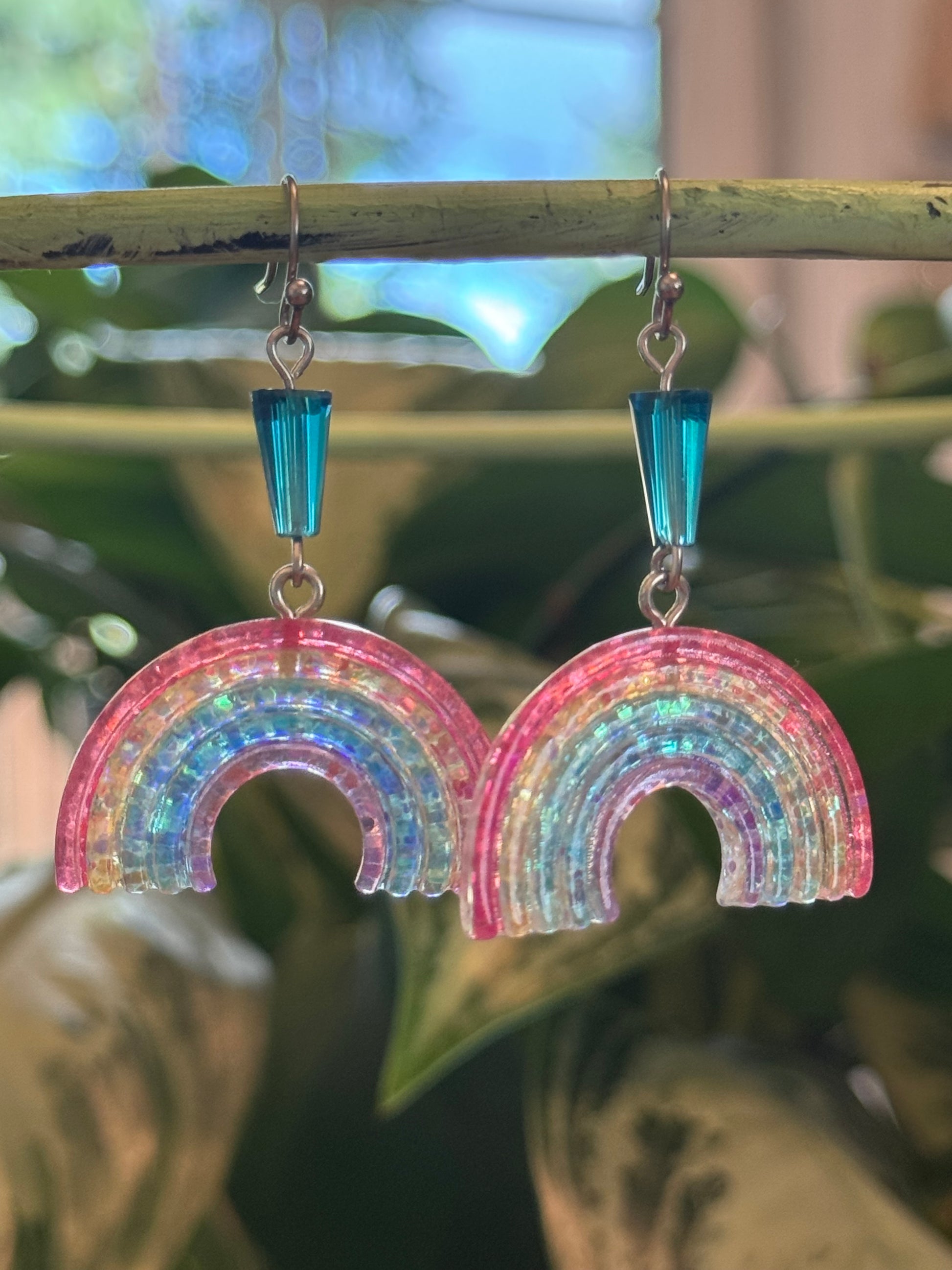 These shimmery acrylic rainbows are fastened beneath blue glass geometric beads. Evocative of the basic fact that we can't have rainbows without the rain, these rainbow earrings are great for everything from a Pride event or a night out to everyday wear for the office or grocery store. The ear wires are hypoallergenic stainless steel. These earrings hang about 1.5 inches long. Handmade in Portland, Oregon. Shipped in gift-ready packaging! 🧚🏻