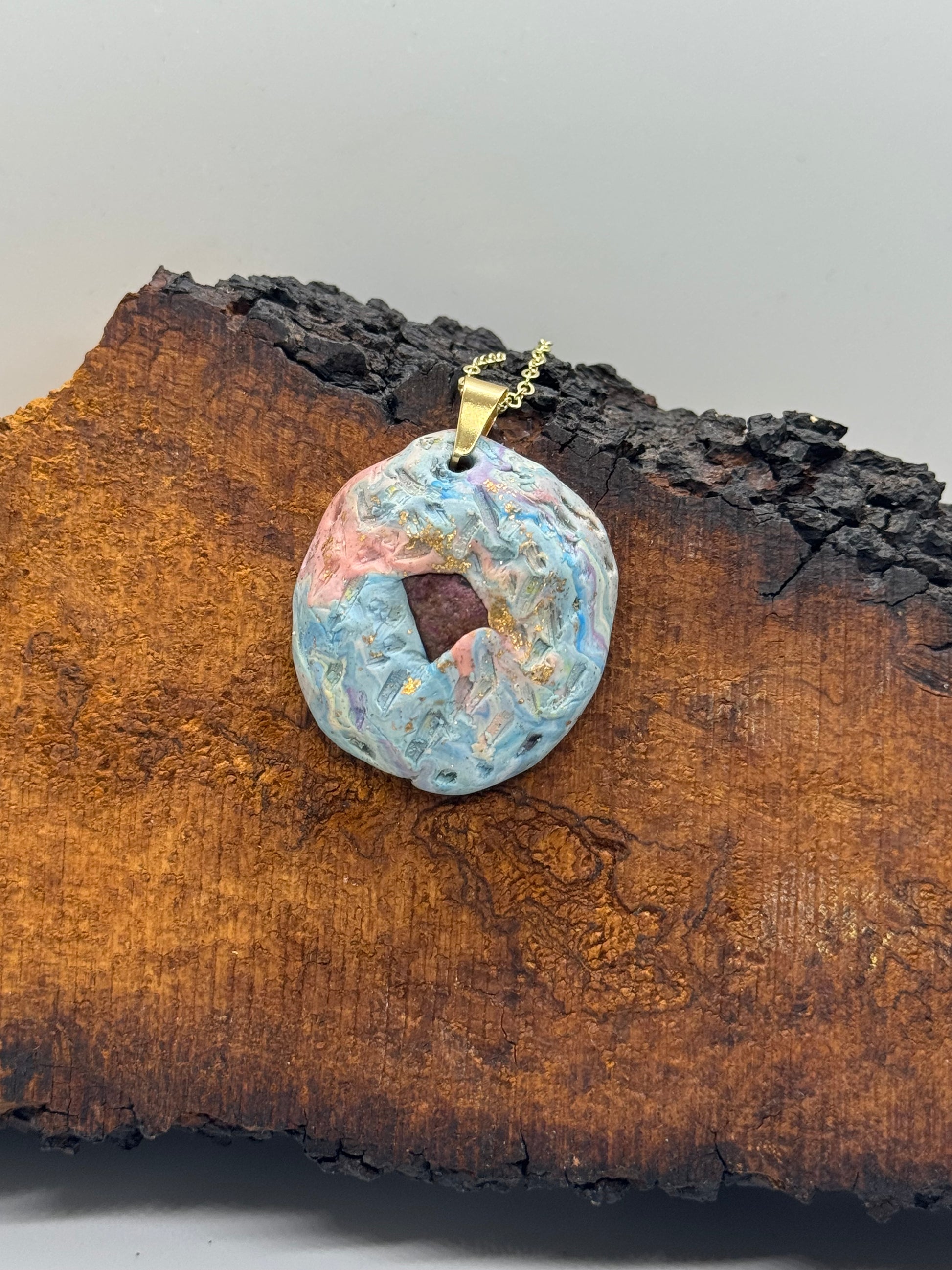 This one-of-a-kind handmade necklace showcases a raw ruby stone set into sculpted polymer clay in varying shades of blue and pink and enhanced with gold-hued copper flakes throughout. Each etched pendant provides a tactile way to center throughout the day. Mounted on a 27-inch chain plated in 14K gold, this piece arrives in gift-ready packaging. Custom chain lengths and metal options are available upon request. Crafted in Oregon.
