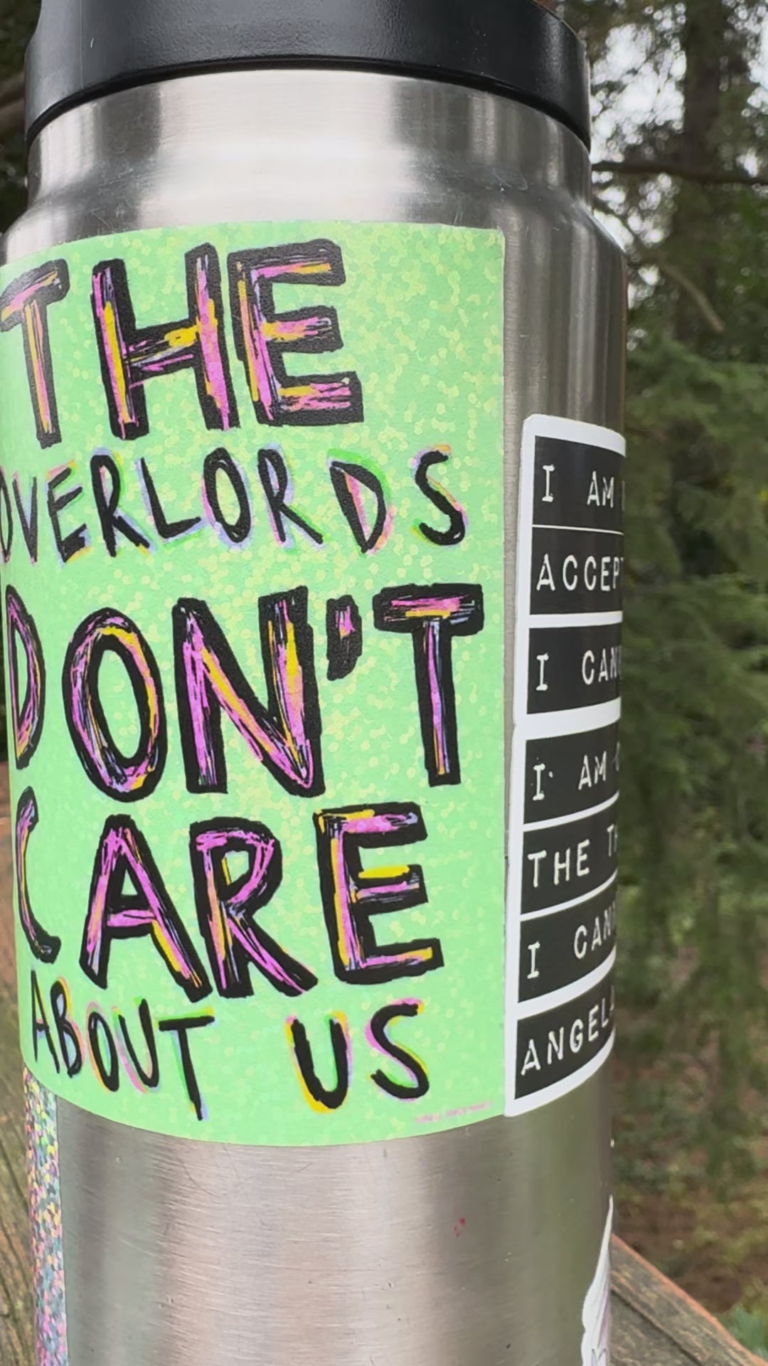 "The overlords don't care about us" sticker. Green and glittery, this reminder can help you keep the core culprits of systemic injustice centered. 4" by 3"